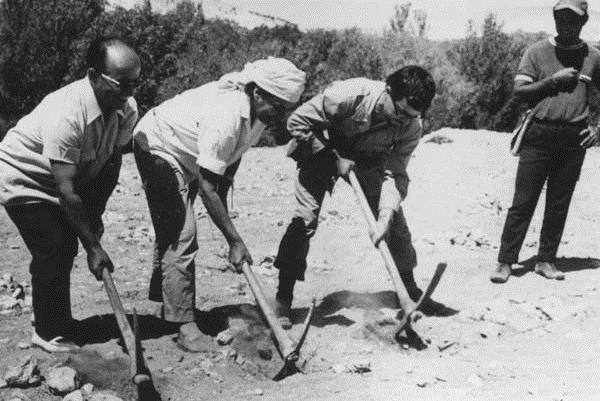ODTÜ Keban Projesi’nin başlangıcı, 1968 yılında Ağın’da “ilk kazma” töreni; soldan sağa Ali Yaramancı, Halet Çambel, Ümit Serdaroğlu